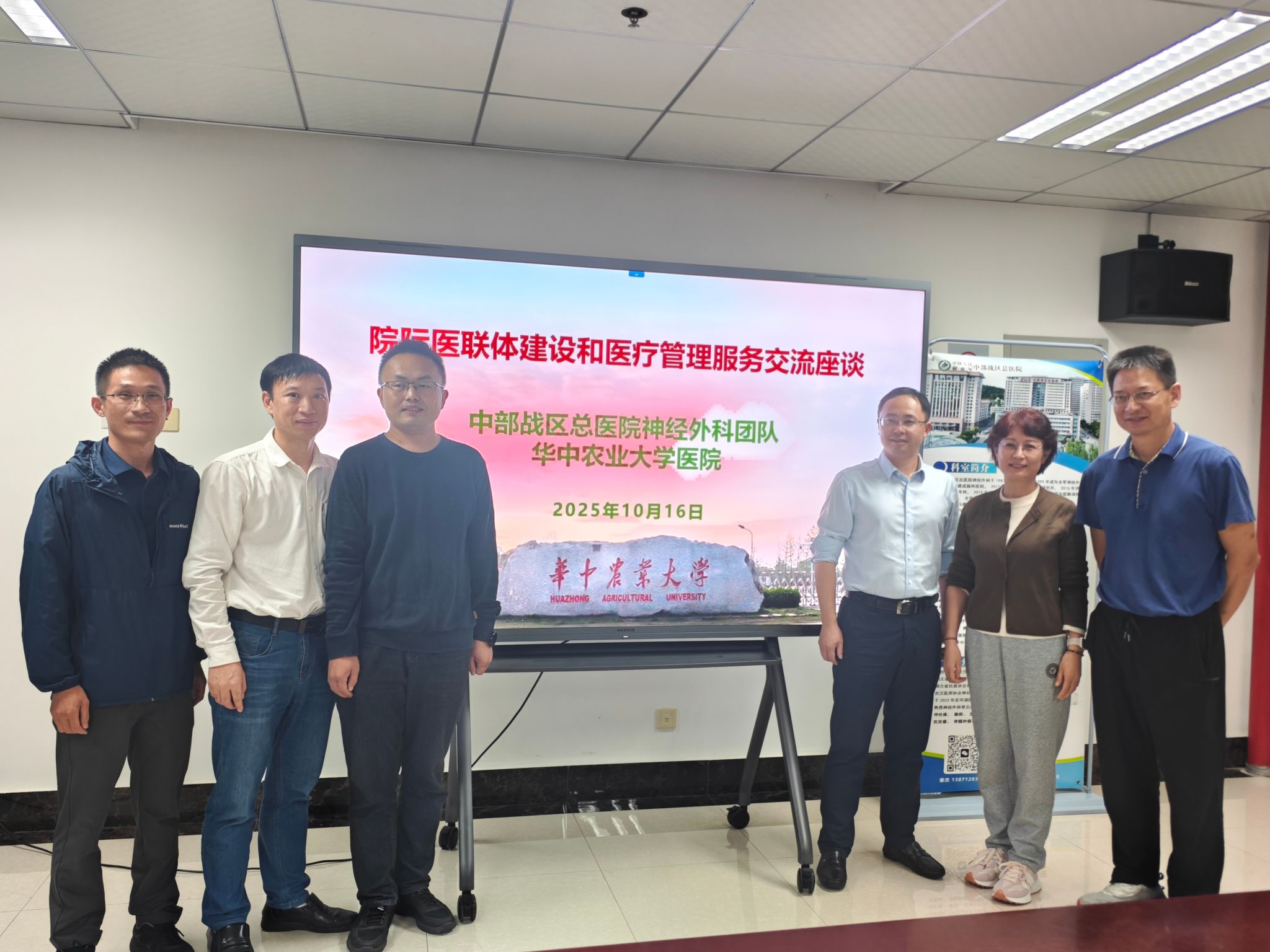 10月16日,华中农业大学医院与中部战区总医院神经外科团队开展院际医联体交流座谈会。中部战区总医院神经外科血管组专家秦杰副主任医师、功能神经外科专家丁慧超副主任医师,校医院班子成员和其他科室骨干参与交流。