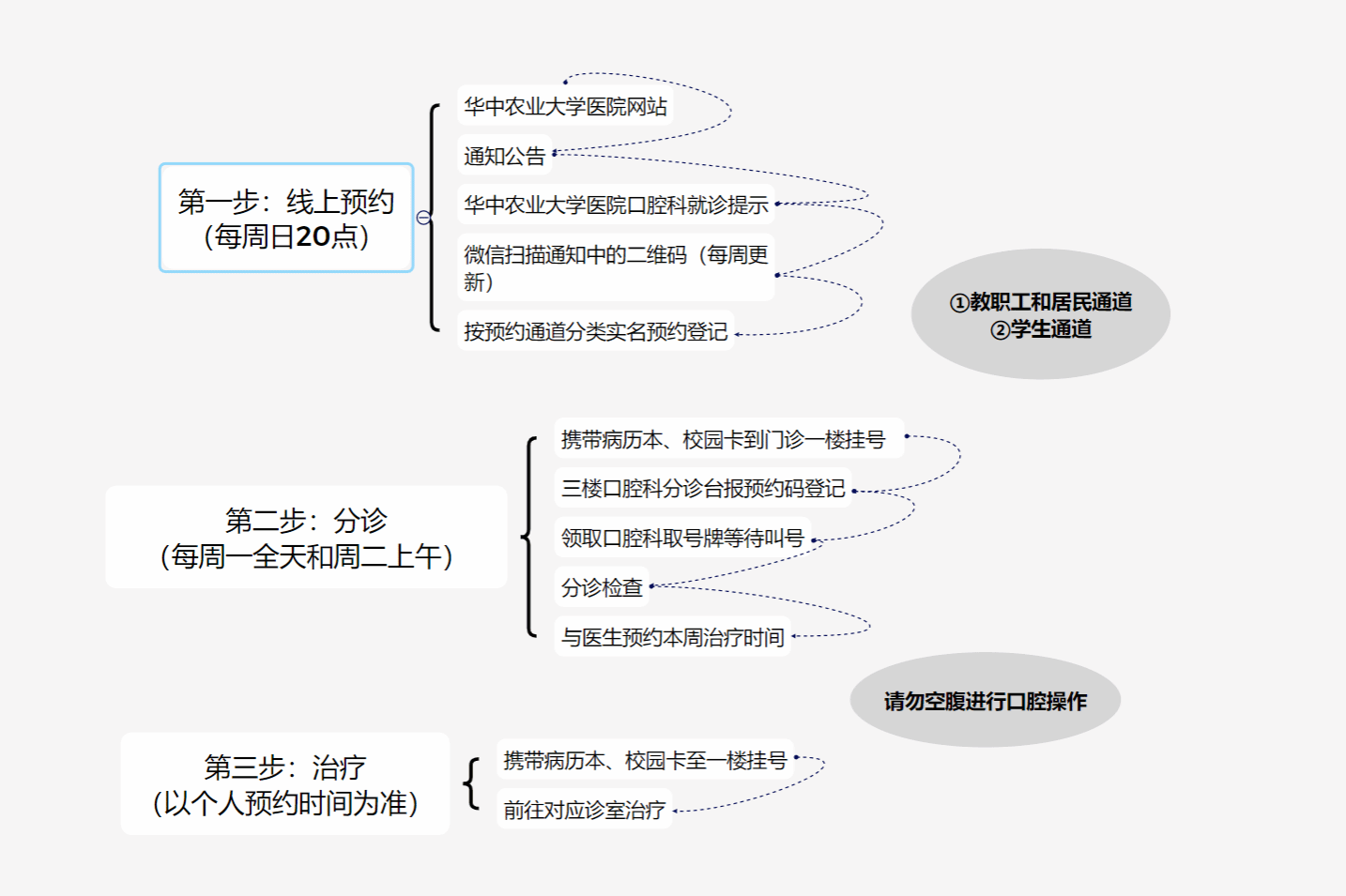 1.为了做好院感防控,避免人员聚集,校医院口腔科诊疗实行线上实名预约登记制,每周日20:00开放下周的预约通道,分为教职工和居民通道、大学生通道,请大家分类预约(禁止学生预约教职工通道)。预约登记时请认真阅读告知内容,并如实正确填写个人信息,一经填写不得更改。为方便老年人就诊,65岁以上的老年人有就诊需求者可于每周一直接到口腔科线下就诊登记。
